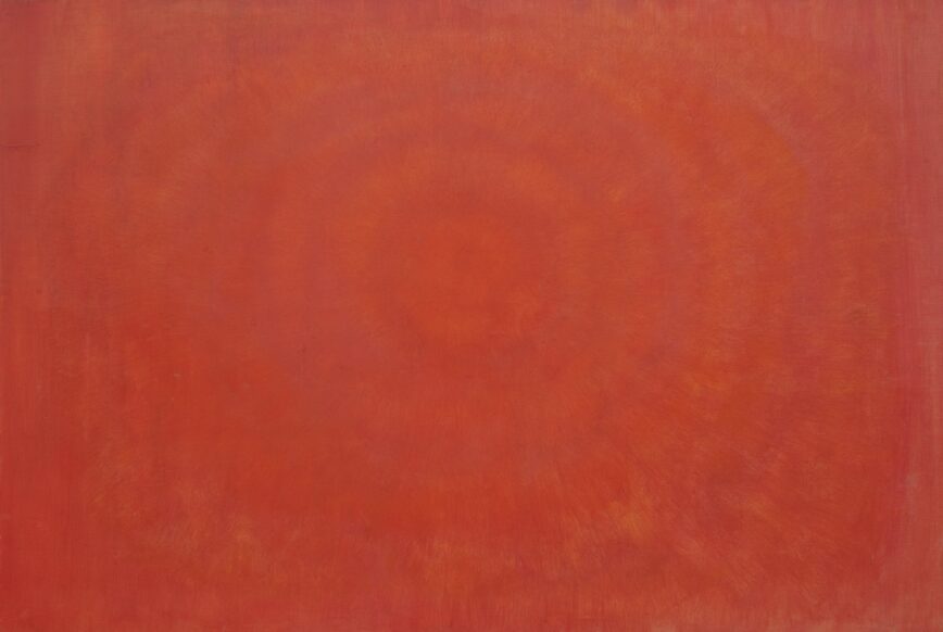 Photo: toile d’Huguette Caland, Soleil Rouge (Red Sun), 1964, huile sur toile de lin, 129.5 x 195.6cm. Source: Tate.